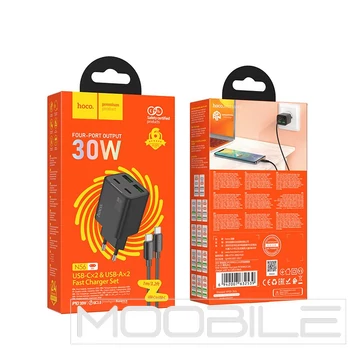 Hoco N56 hálózati töltő 2×USB-C + 2×USB-A PD/QC3.0 30W + Type-C–Type-C kábel – Fekete